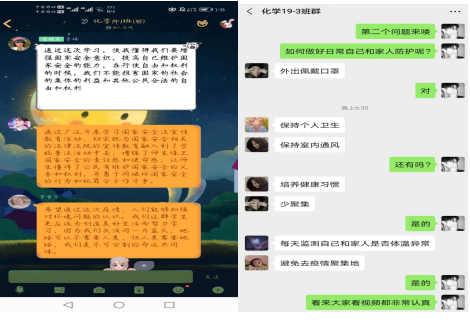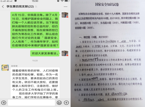 今年国家安全日的主题为“坚持总体国家安全观,统筹传统安全和非传统安全,为决胜全面建成小康社会提供坚强保障”。在公开课中,清华大学公共安全研究院范维澄和陈建国分享了关于总体国家安全观视角下的疫情防控情况,从国家安全、生物安全与公共安全卫生安全治理以及新冠状疫情爆发对国家安全的危机等方面进行解读。观看公开课后,各学生党支部、团支部积极地在线上以“维护国家安全,人人有责”为主题展开讨论。线上讨论气氛活跃,反响热烈,同学们就国家安全问题发表了自己的看法。有国才有家,有家才有我们。只有国家稳定发展,我们才能安居乐业。作为一名大学生,我们牢固树立国家安全意识,增强对国家的责任感和民族使命感。