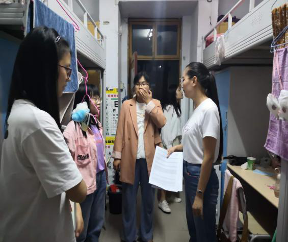 在走访过程中,领导老师与新生亲切交谈,询问新同学的籍贯、家乡风俗以及住宿情况等。新生们感谢学院领导老师对他们的关心,感谢学长学姐们的帮助。随后,刘瑛介绍学院情况并叮嘱同学们有问题要及时向老师汇报,积极配合学校、学院的防疫工作,保持健康的作息规律和良好的生活习惯。