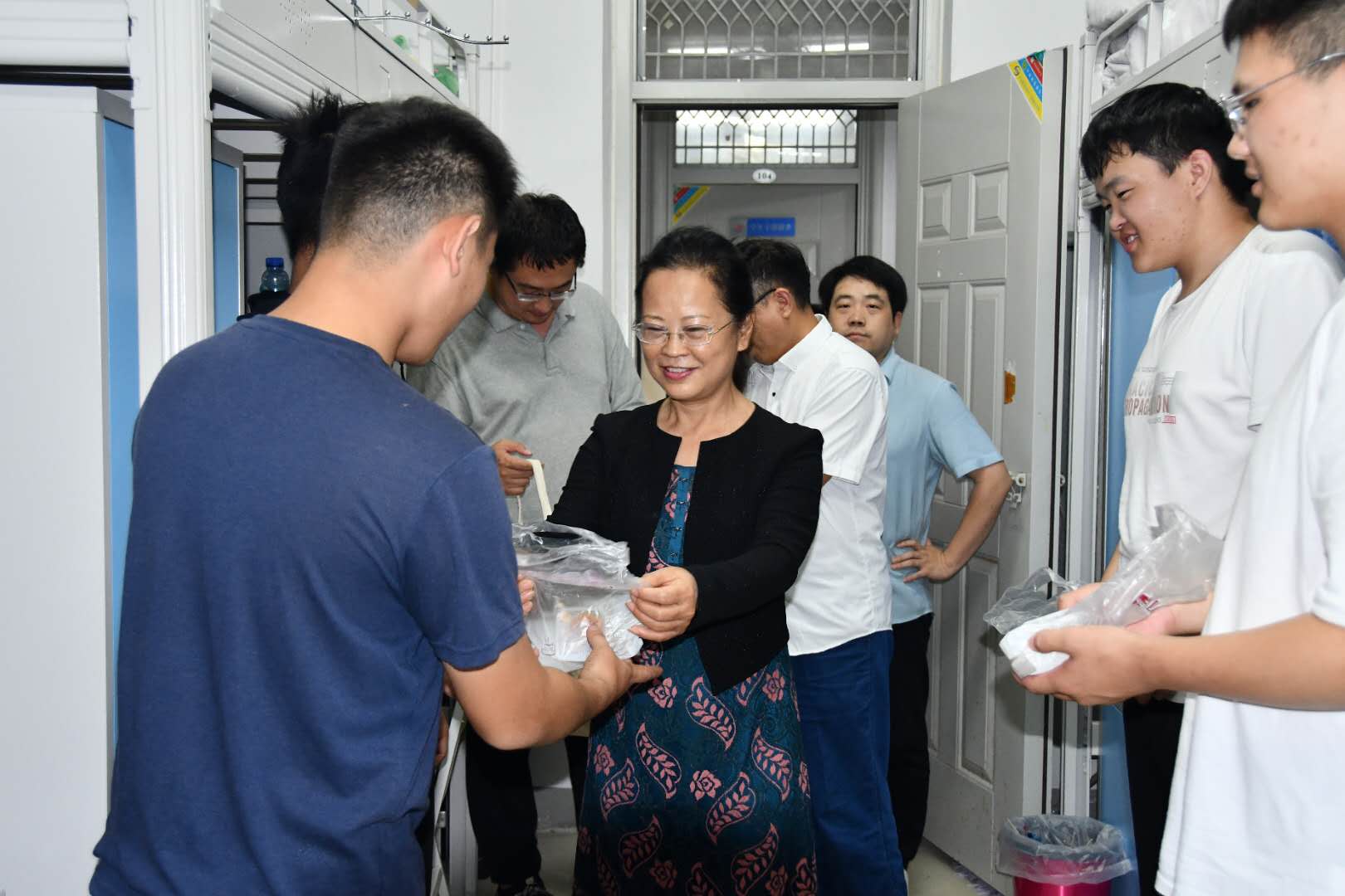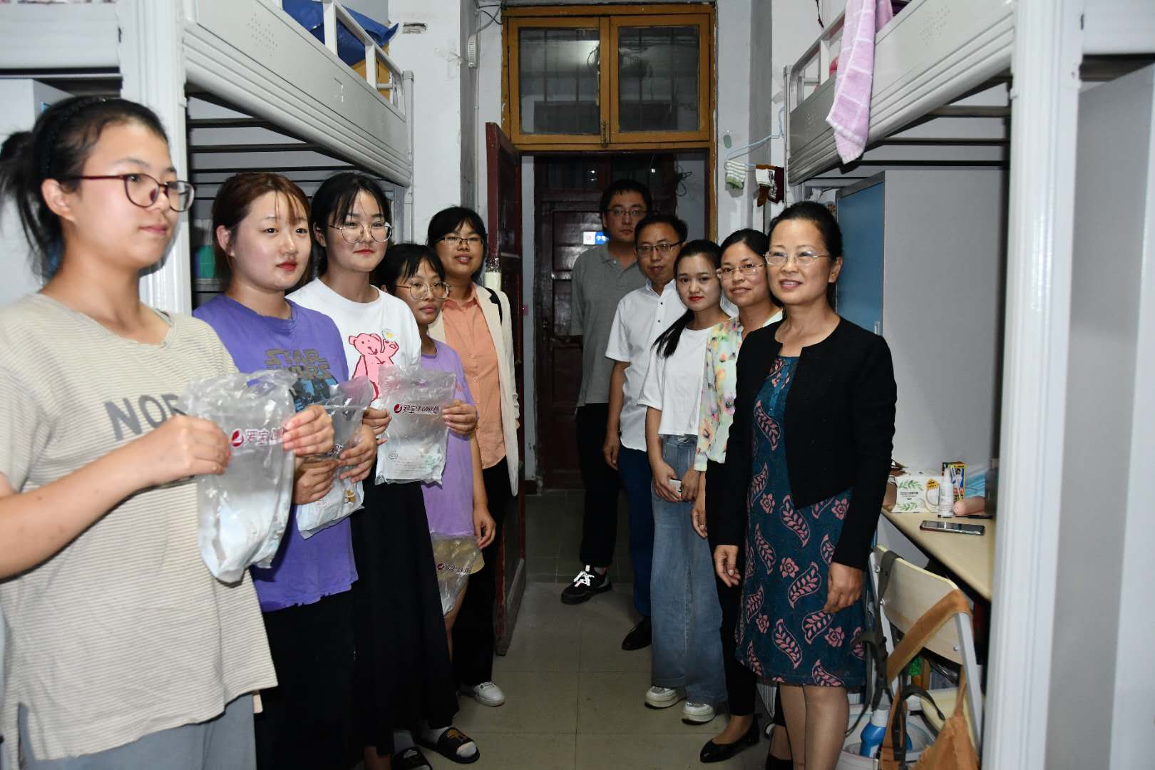 当中秋邂逅国庆,名为家国同庆,欢聚的门化成皎洁的明月带远方的人回家,让长挂星空的思念落地,点亮万家灯火,温暖中华大地。为了让新生感受到家一般的温暖,2020年9月30日下午,米兰体育官方网站党总支副书记刘瑛带领辅导员、2020级新生班主任到宿舍看望慰问新生,并为新生发放月饼,送上国庆、中秋双节祝福。