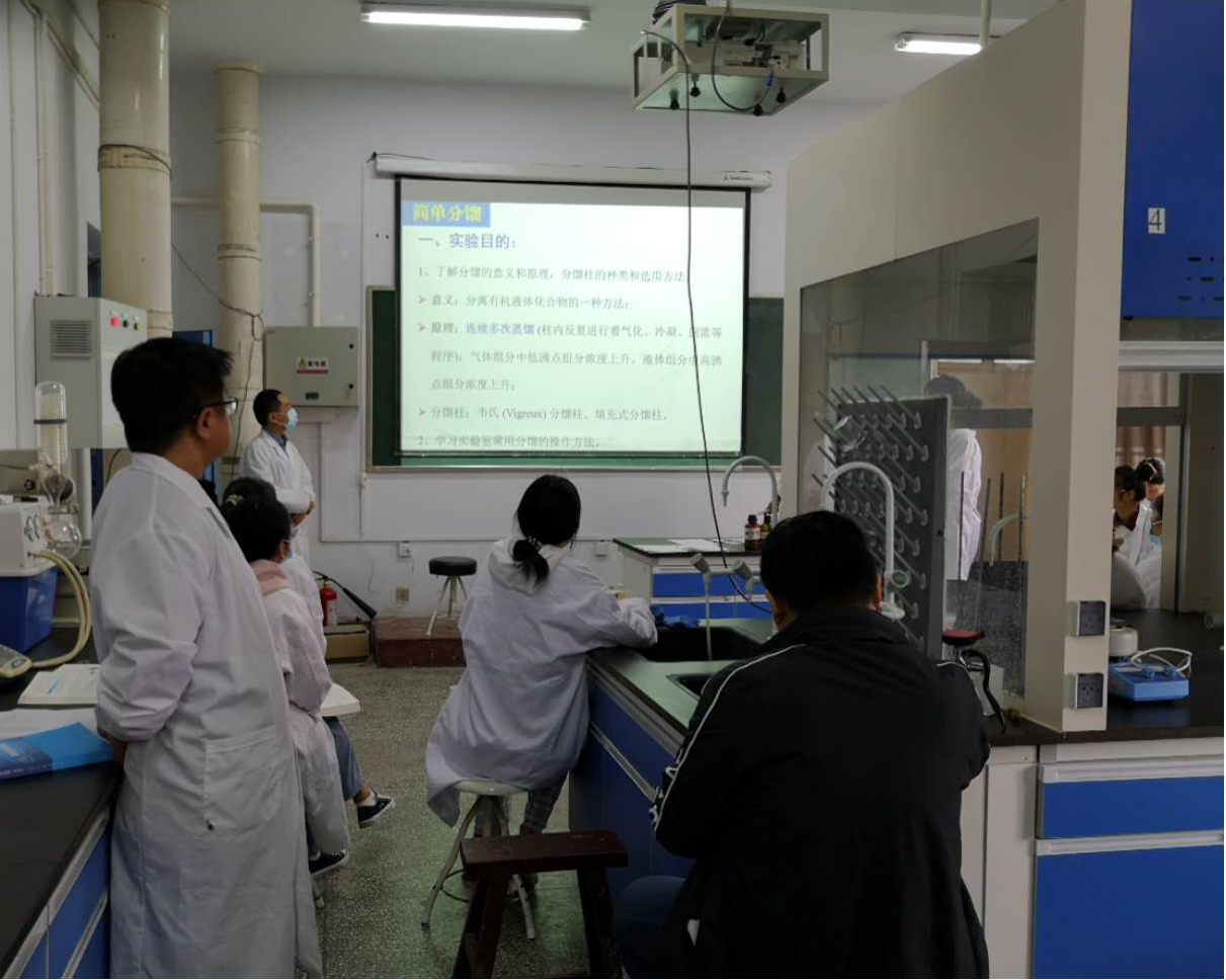 2020年10月10日,在化学实验楼407实验室,米兰体育官方网站青年教师李国柱博士进行了《有机化学实验》之《简单分馏》的公开课,学院院长孟团结教授及部分教师现场观摩指导。基于促进青年教师间的学习交流,提高青年教师专业素养的背景,米兰体育官方网站本学期继续开展青年教师公开课活动。
